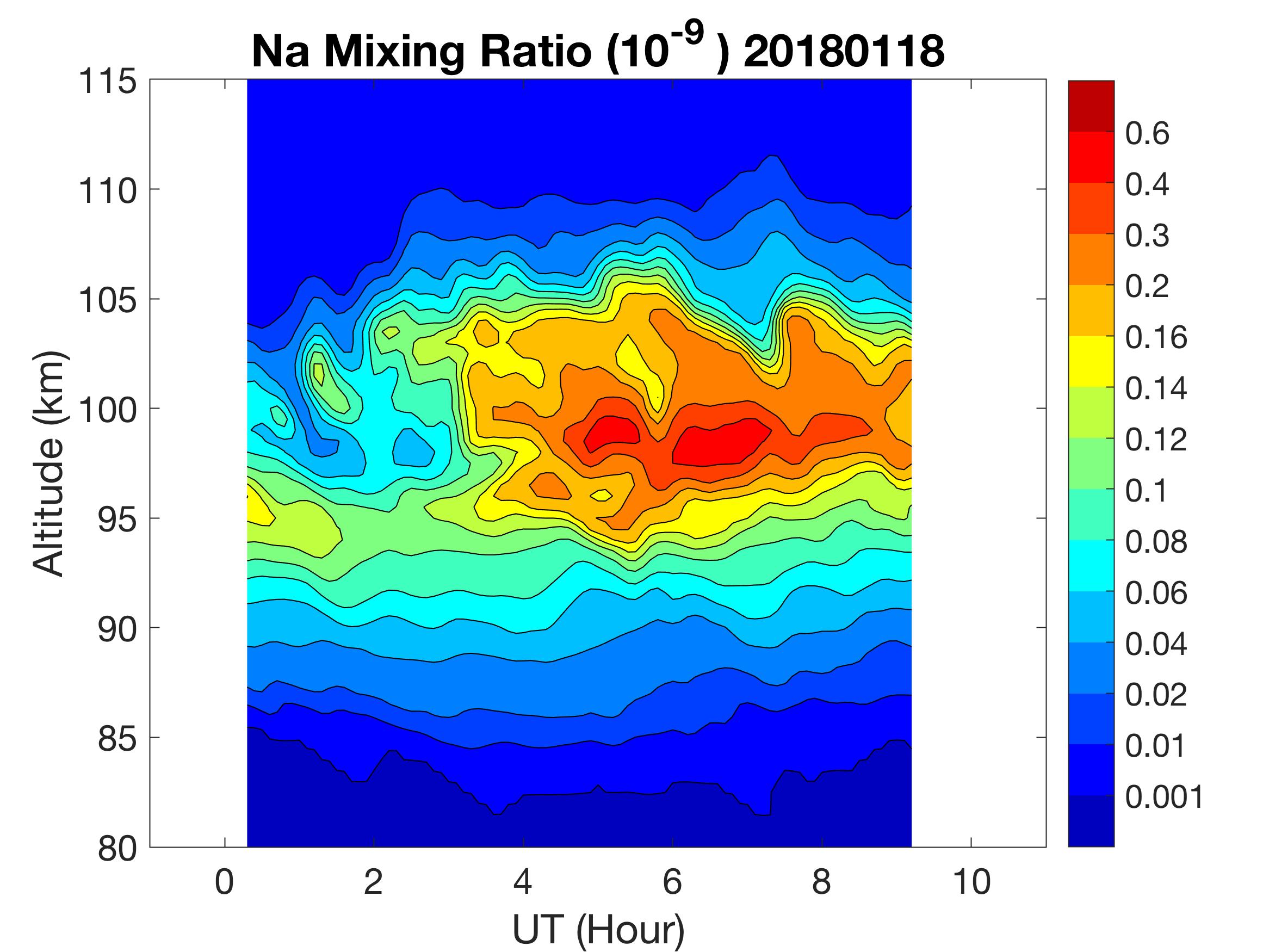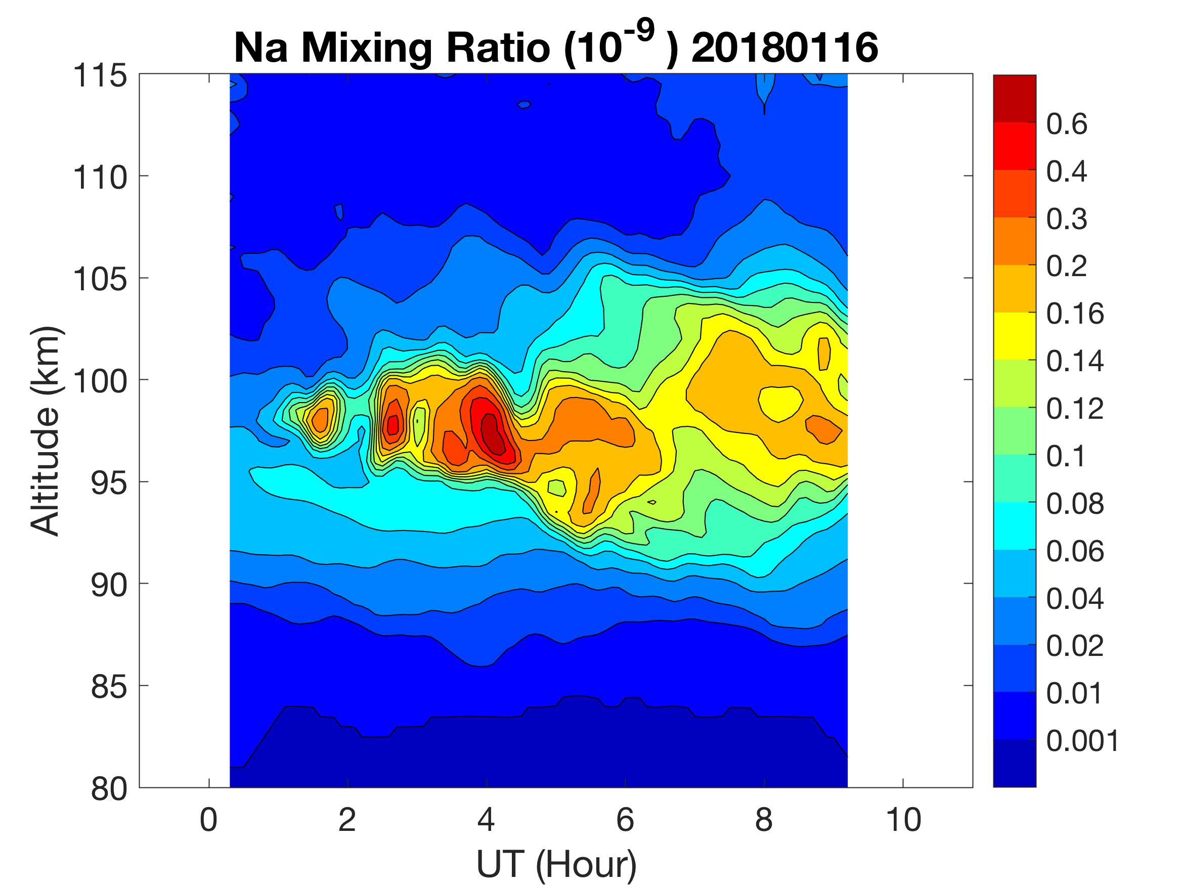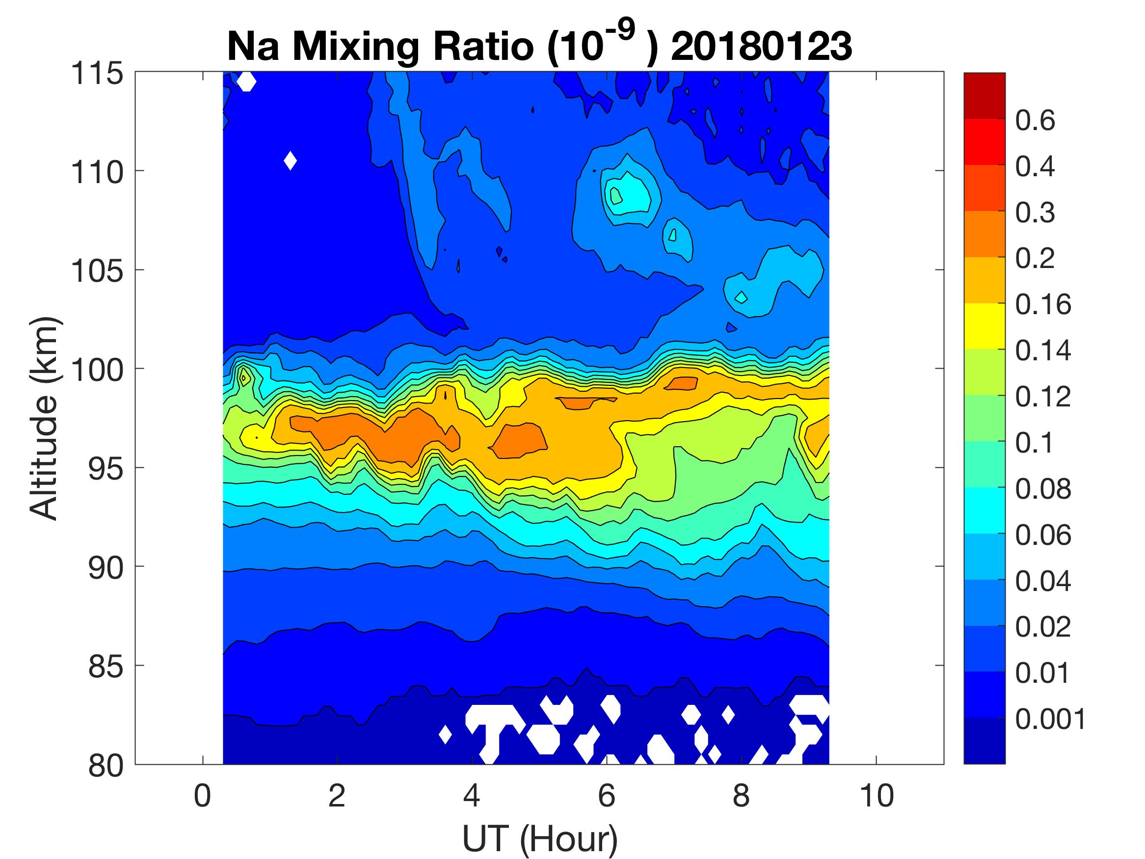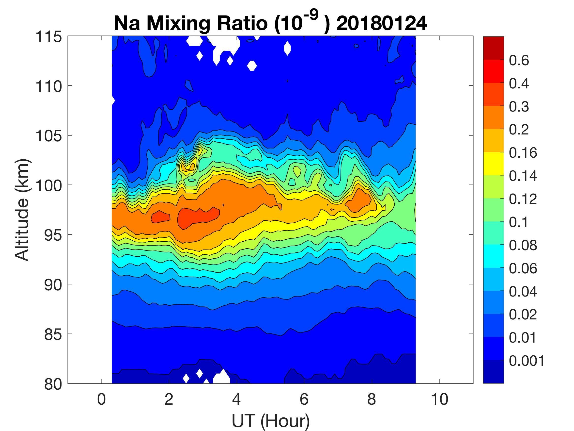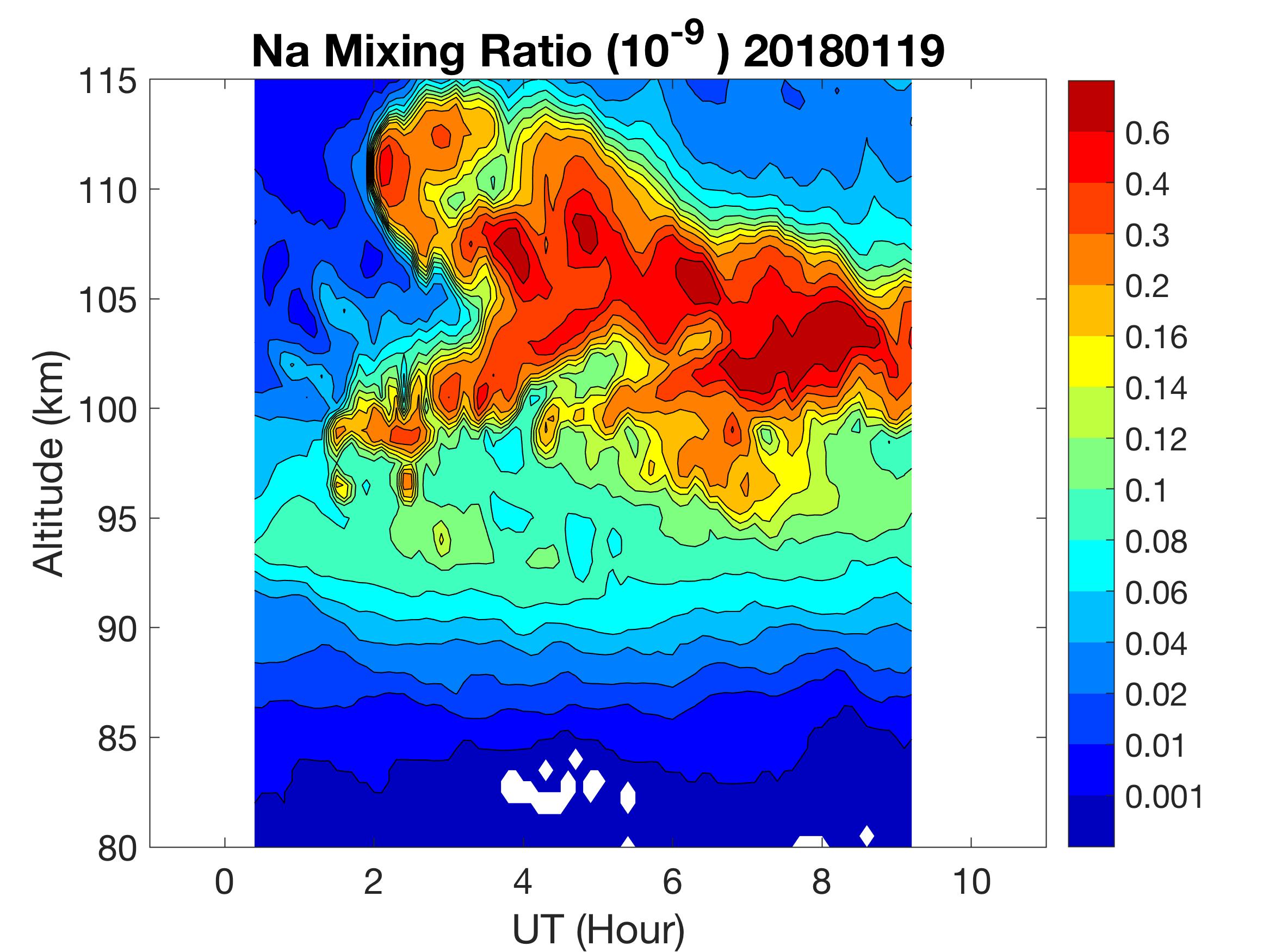 The lidar was operated in zenith mode on all nights. The integration time for processed data is 90 s. The smoothing window is 30 min and 1 km full width due to lower signals up to Jan 18. Starting on Jan 19, the temporal smoothing window is reduced to 15 min due to better signals. No horizontal wind was measured due to beam steering problem. Na mixing ratio contours are added.