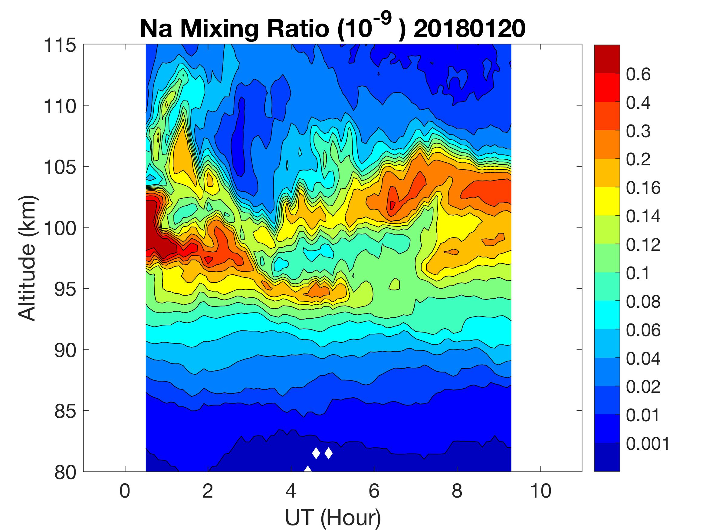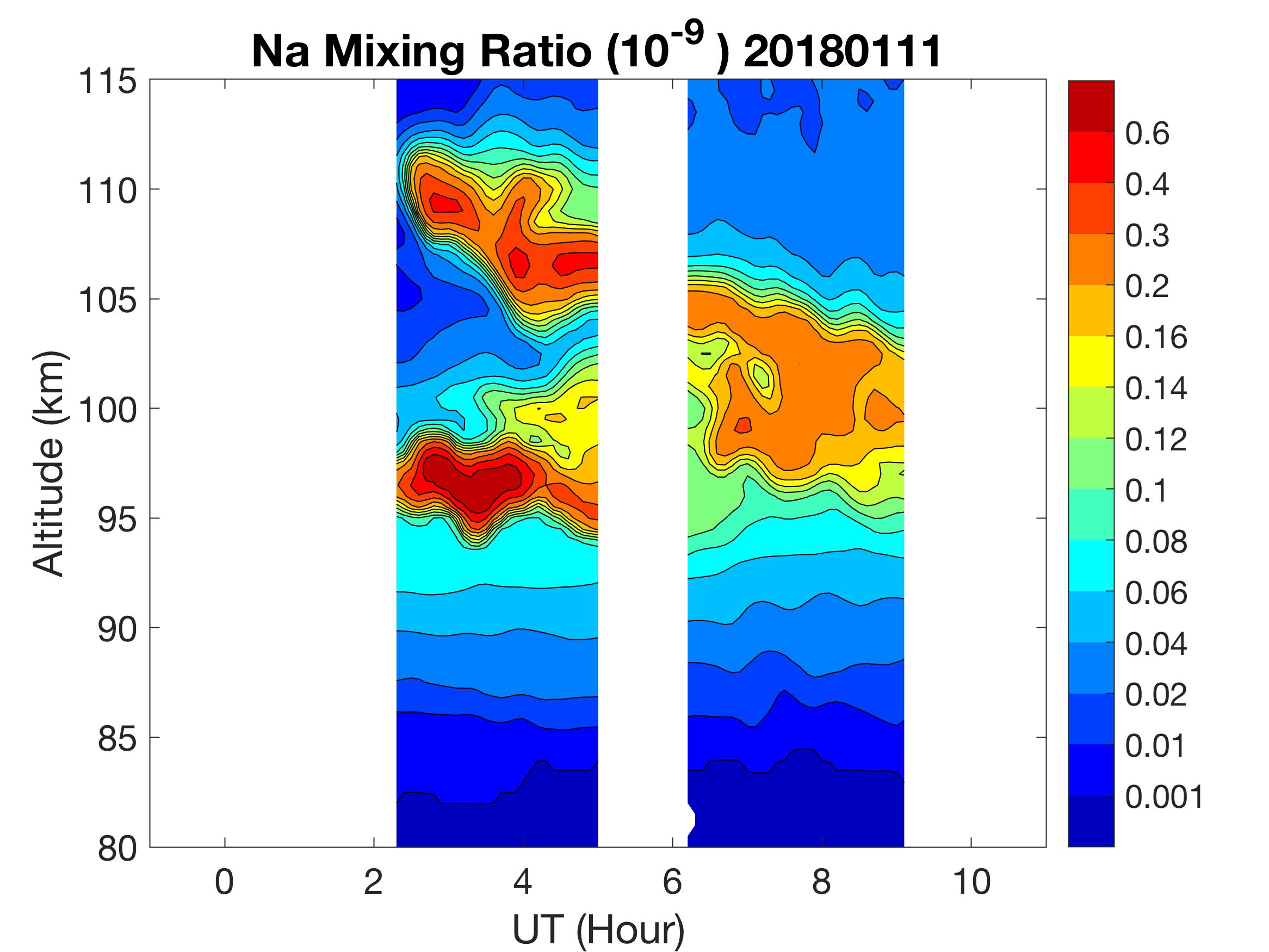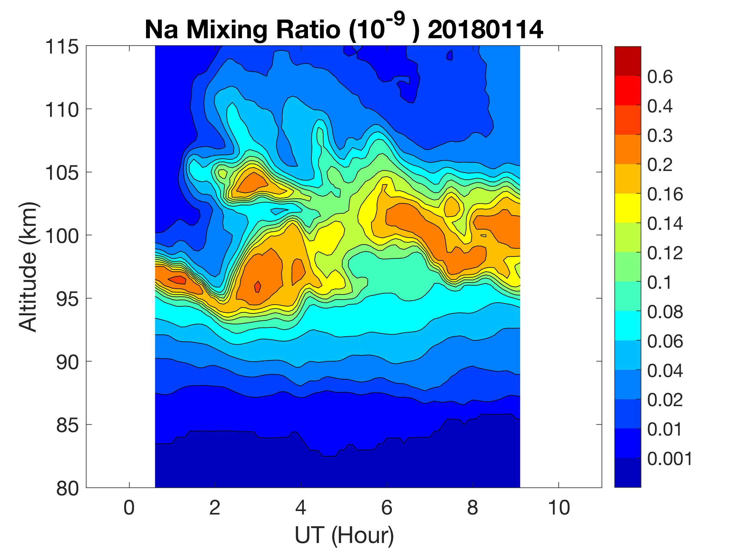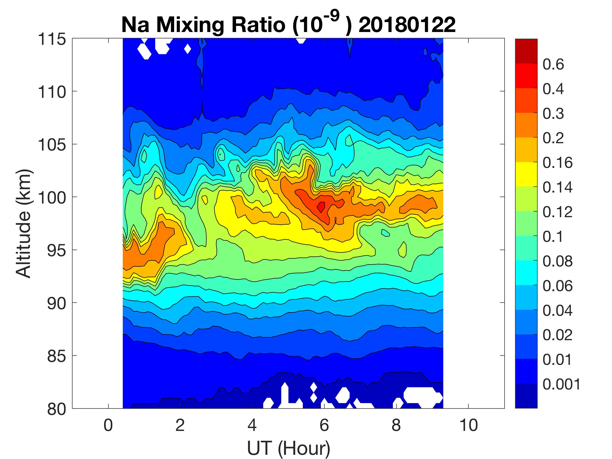 The lidar was operated in zenith mode on all nights. The integration time for processed data is 90 s. The smoothing window is 30 min and 1 km full width due to lower signals up to Jan 18. Starting on Jan 19, the temporal smoothing window is reduced to 15 min due to better signals. No horizontal wind was measured due to beam steering problem. Na mixing ratio contours are added.