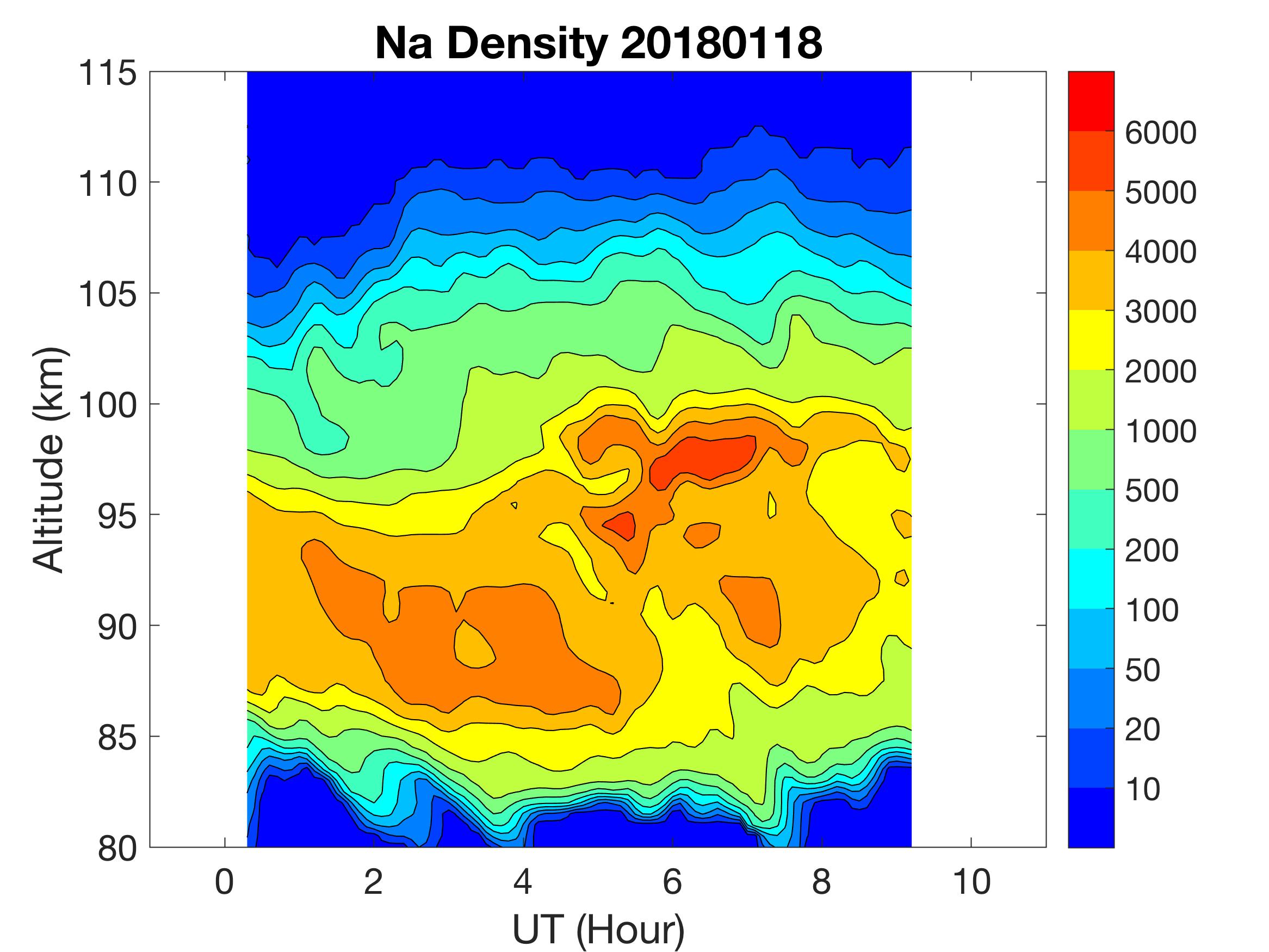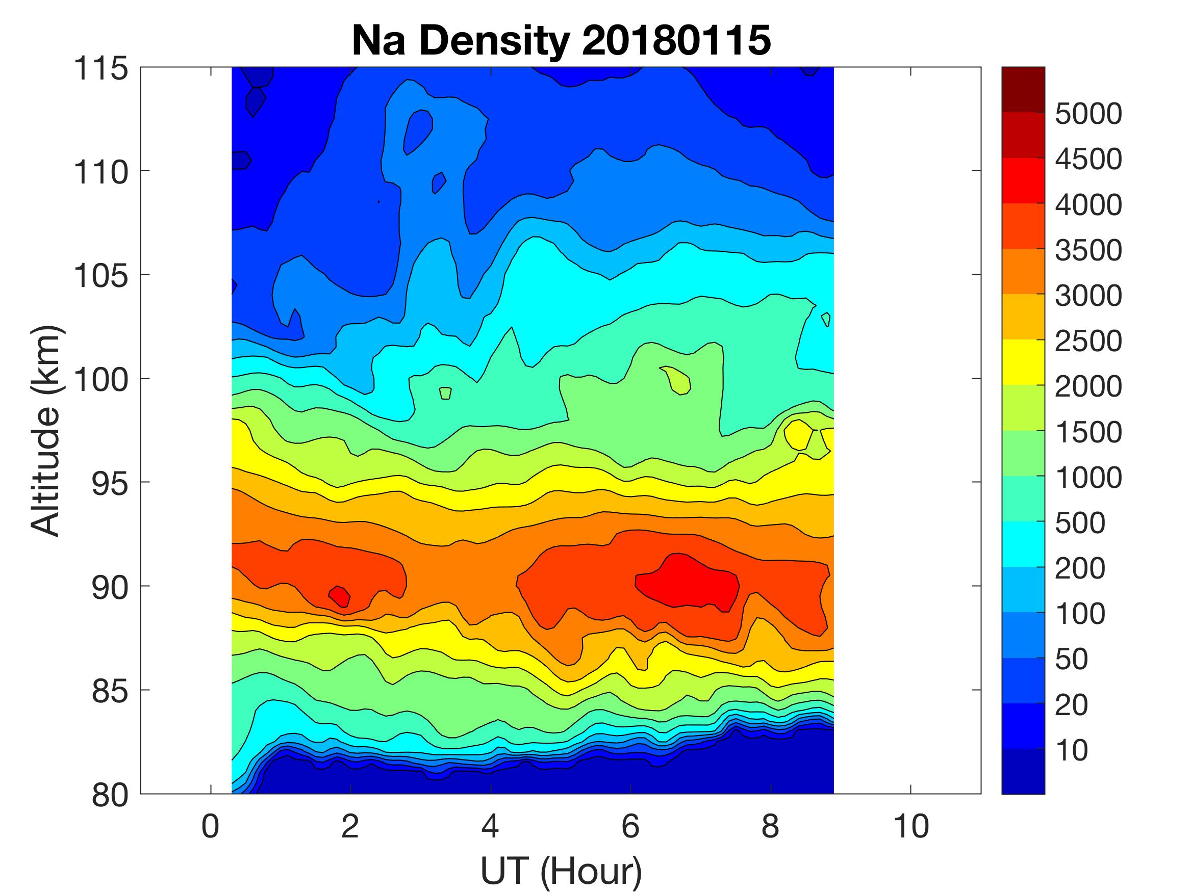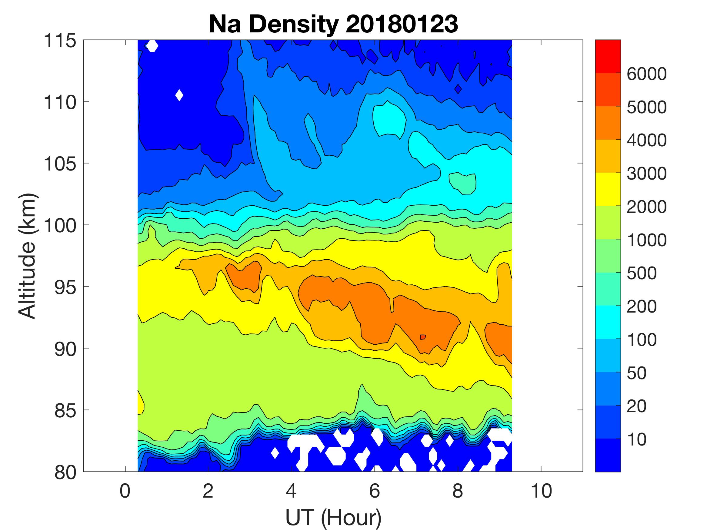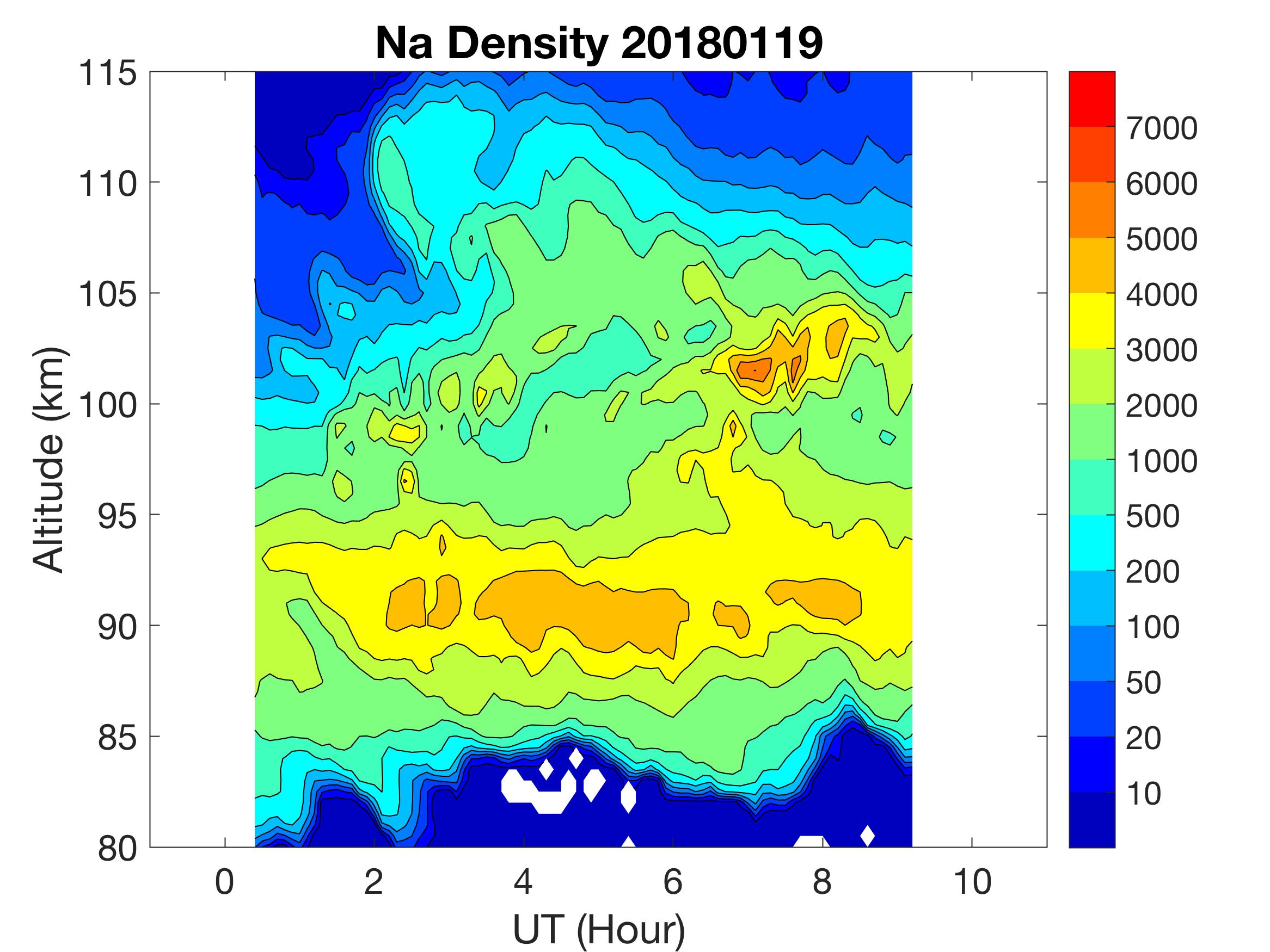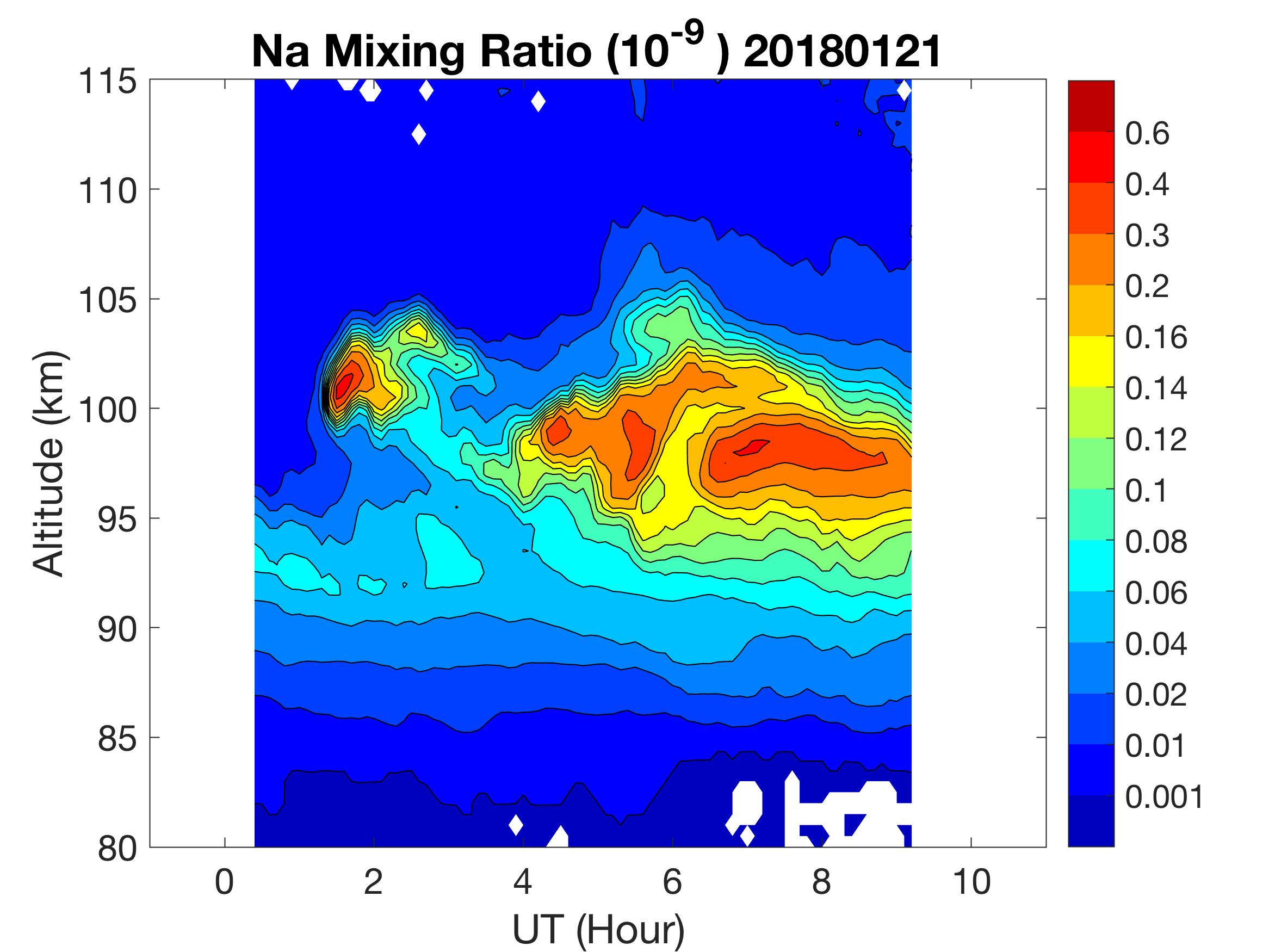The lidar was operated in zenith mode on all nights. The integration time for processed data is 90 s. The smoothing window is 30 min and 1 km full width due to lower signals up to Jan 18. Starting on Jan 19, the temporal smoothing window is reduced to 15 min due to better signals. No horizontal wind was measured due to beam steering problem. Na mixing ratio contours are added.