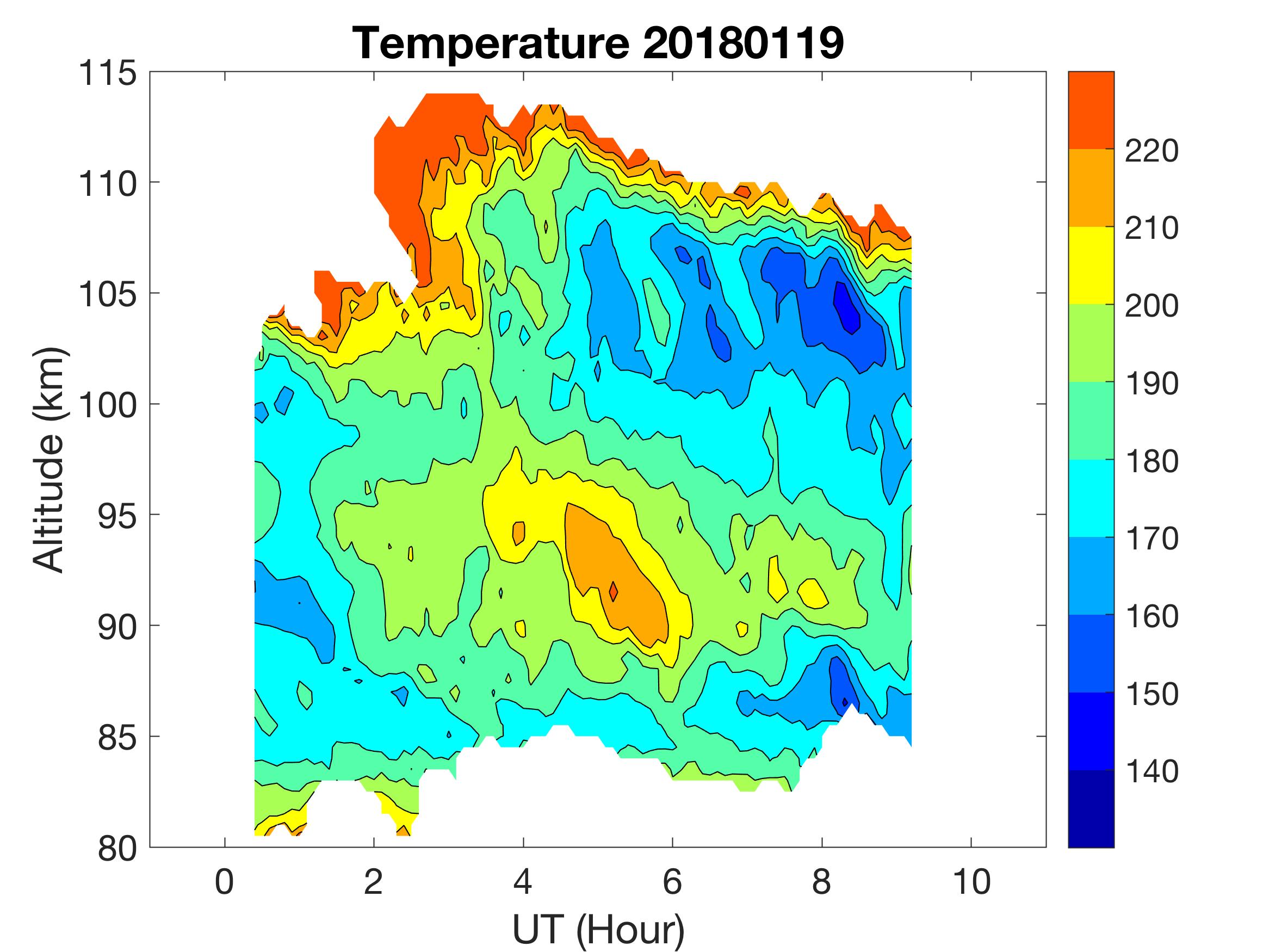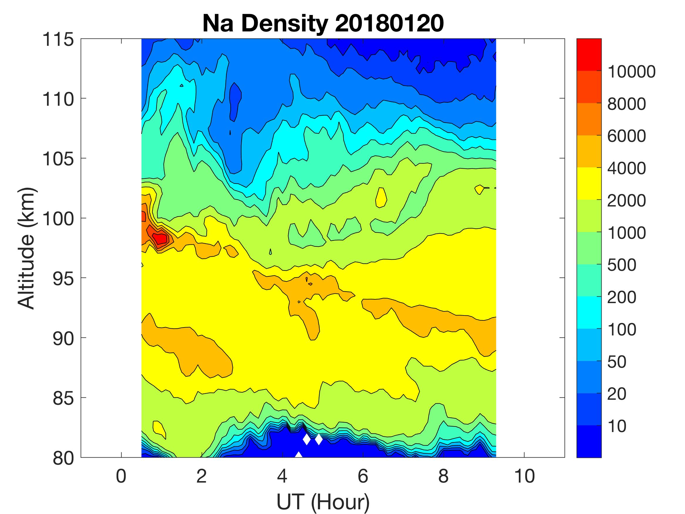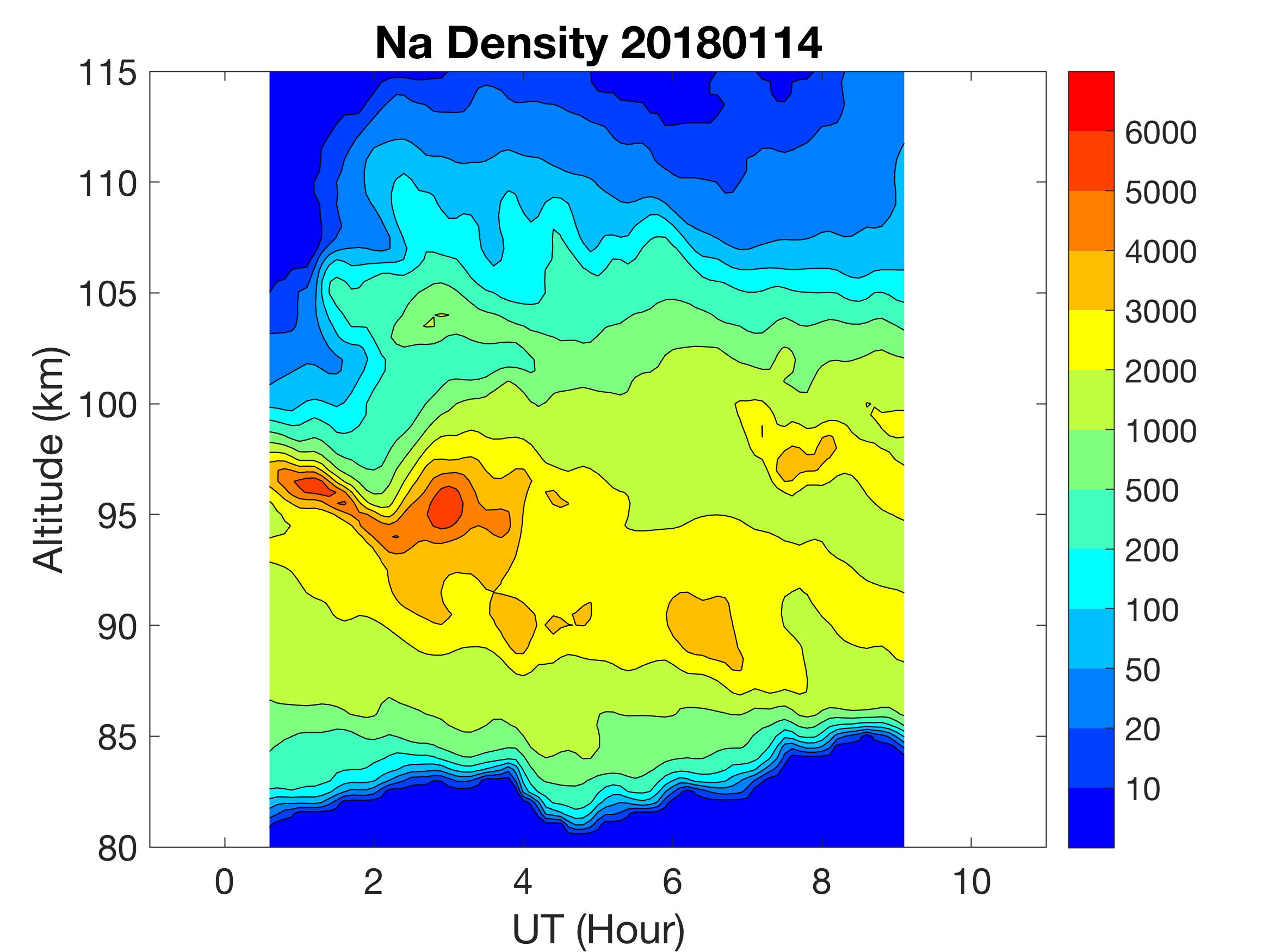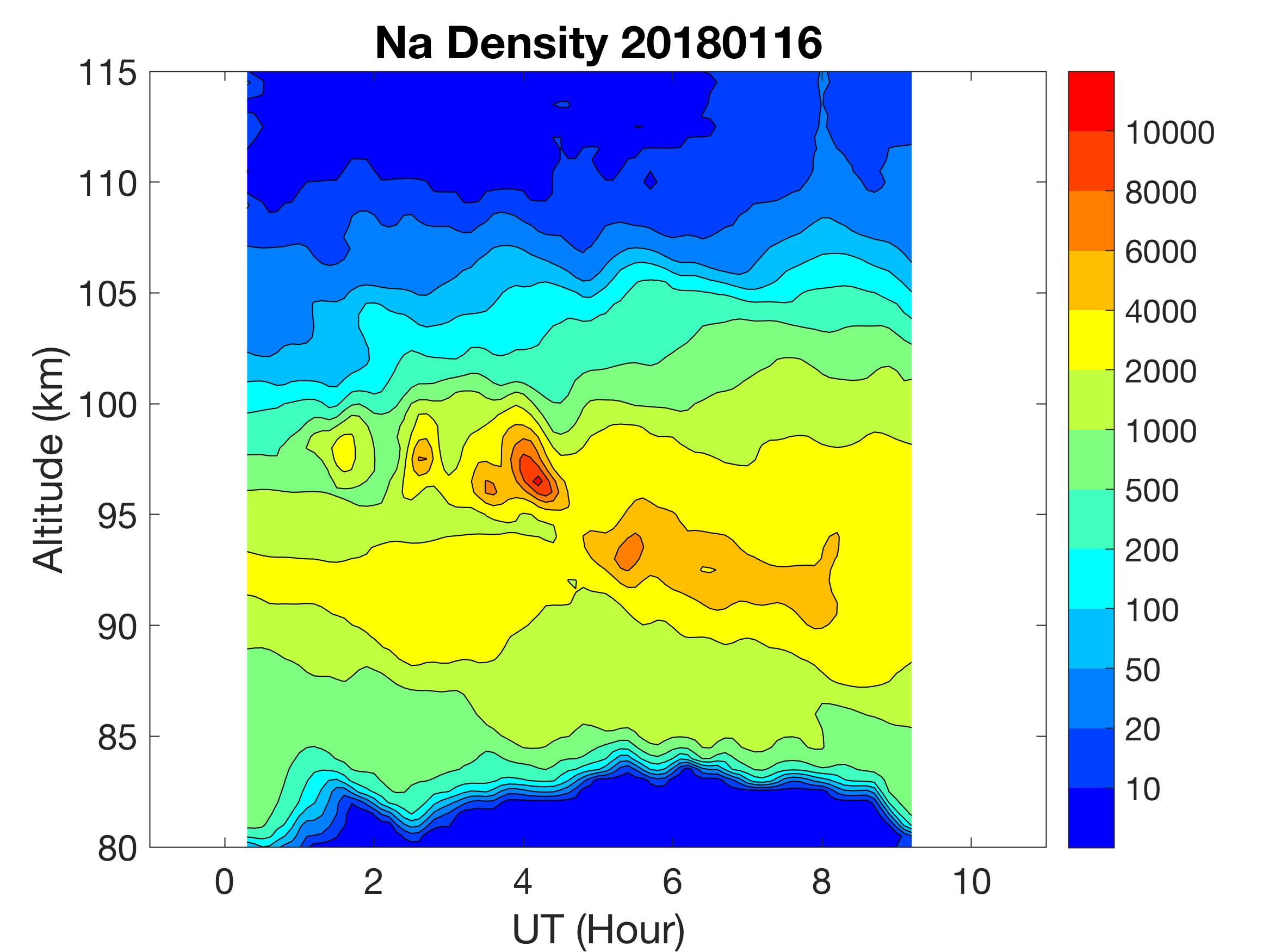 The lidar was operated in zenith mode on all nights. The integration time for processed data is 90 s. The smoothing window is 30 min and 1 km full width due to lower signals up to Jan 18. Starting on Jan 19, the temporal smoothing window is reduced to 15 min due to better signals. No horizontal wind was measured due to beam steering problem. Na mixing ratio contours are added.