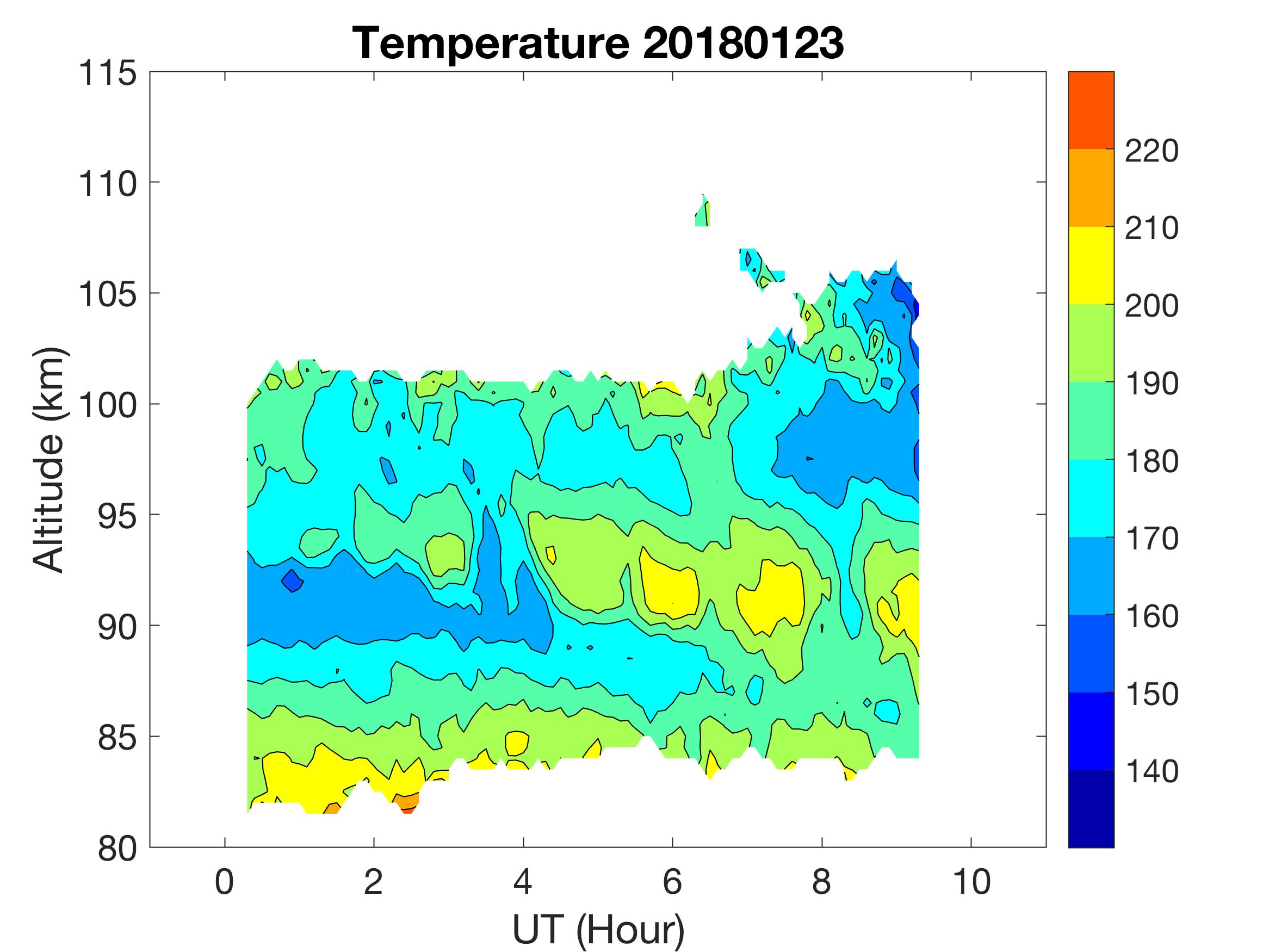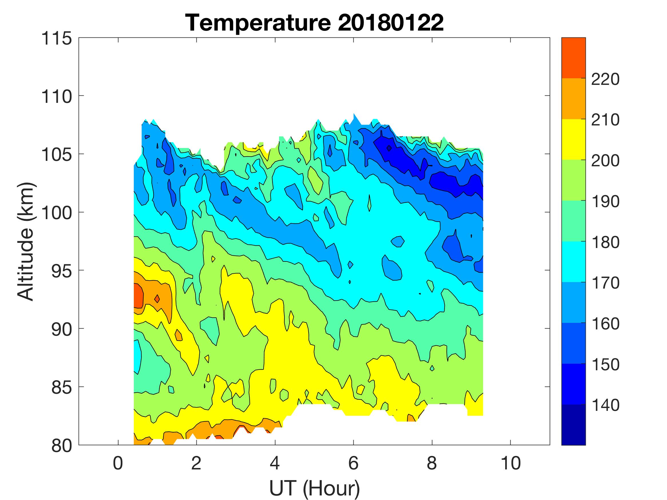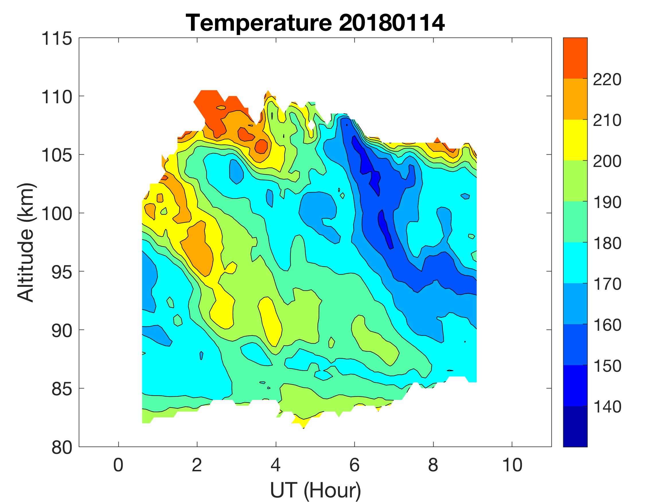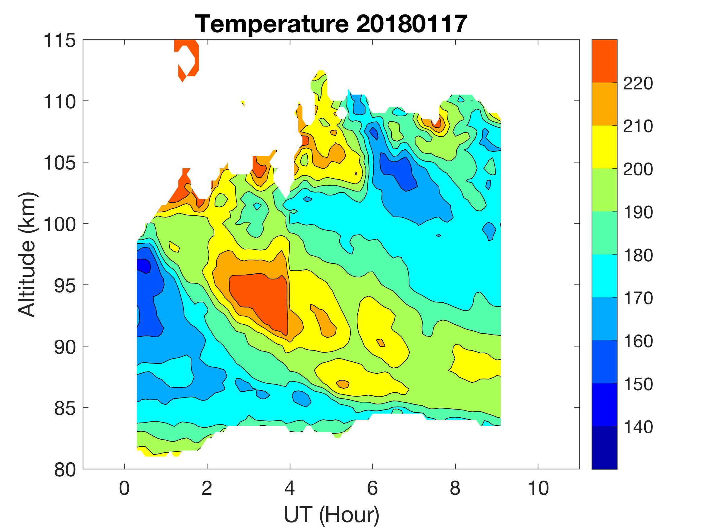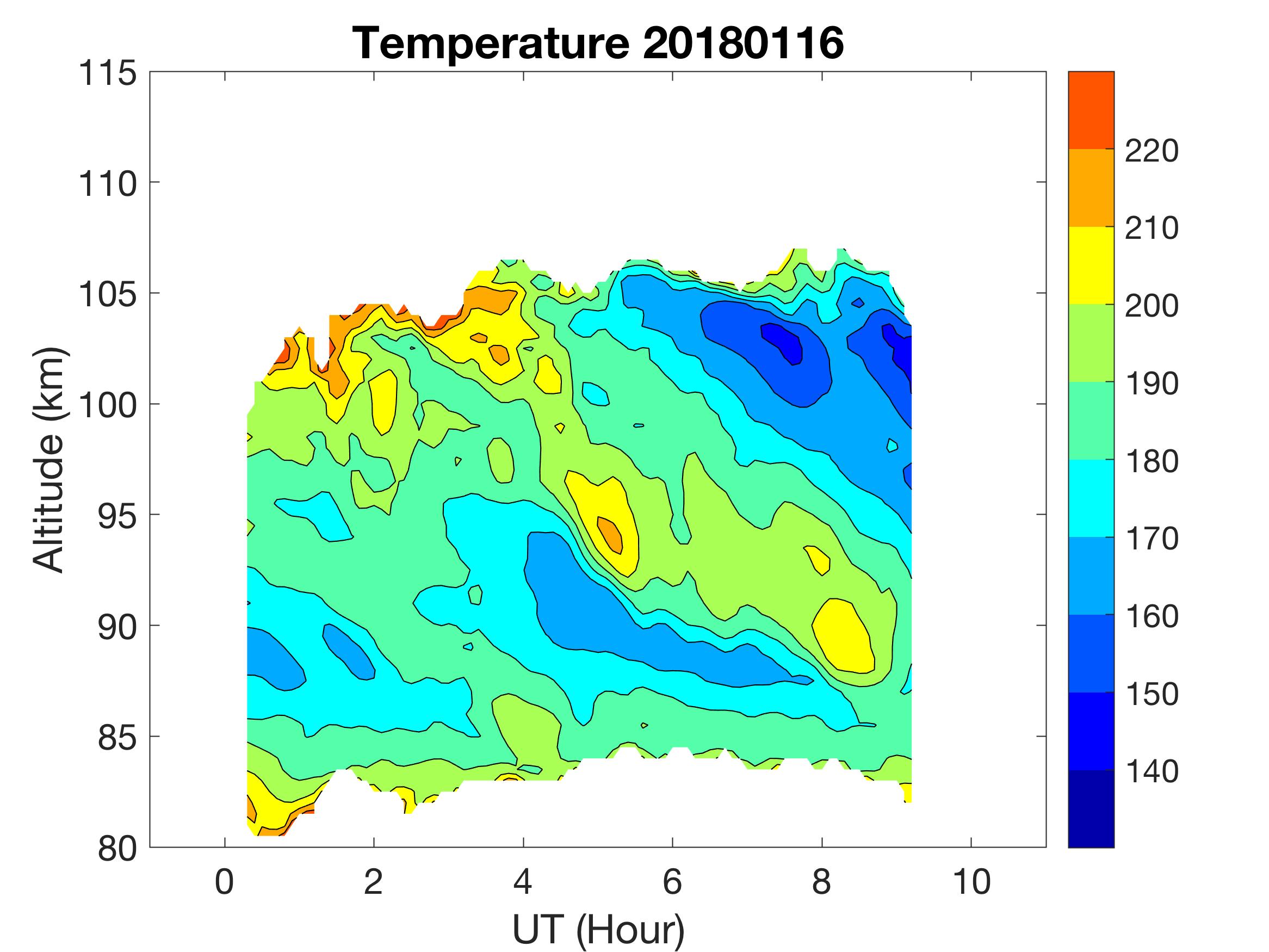 The lidar was operated in zenith mode on all nights. The integration time for processed data is 90 s. The smoothing window is 30 min and 1 km full width due to lower signals up to Jan 18. Starting on Jan 19, the temporal smoothing window is reduced to 15 min due to better signals. No horizontal wind was measured due to beam steering problem. Na mixing ratio contours are added.
