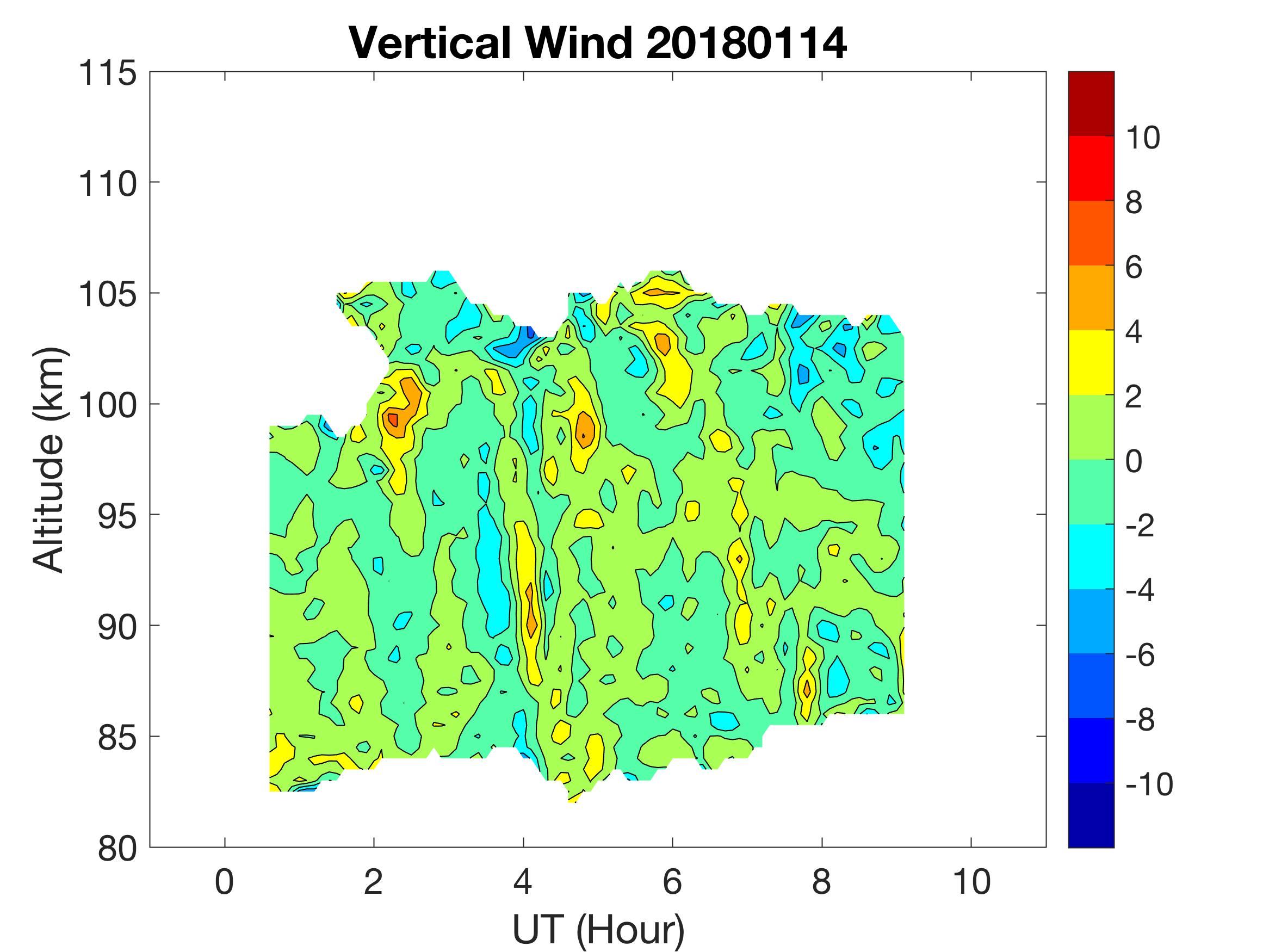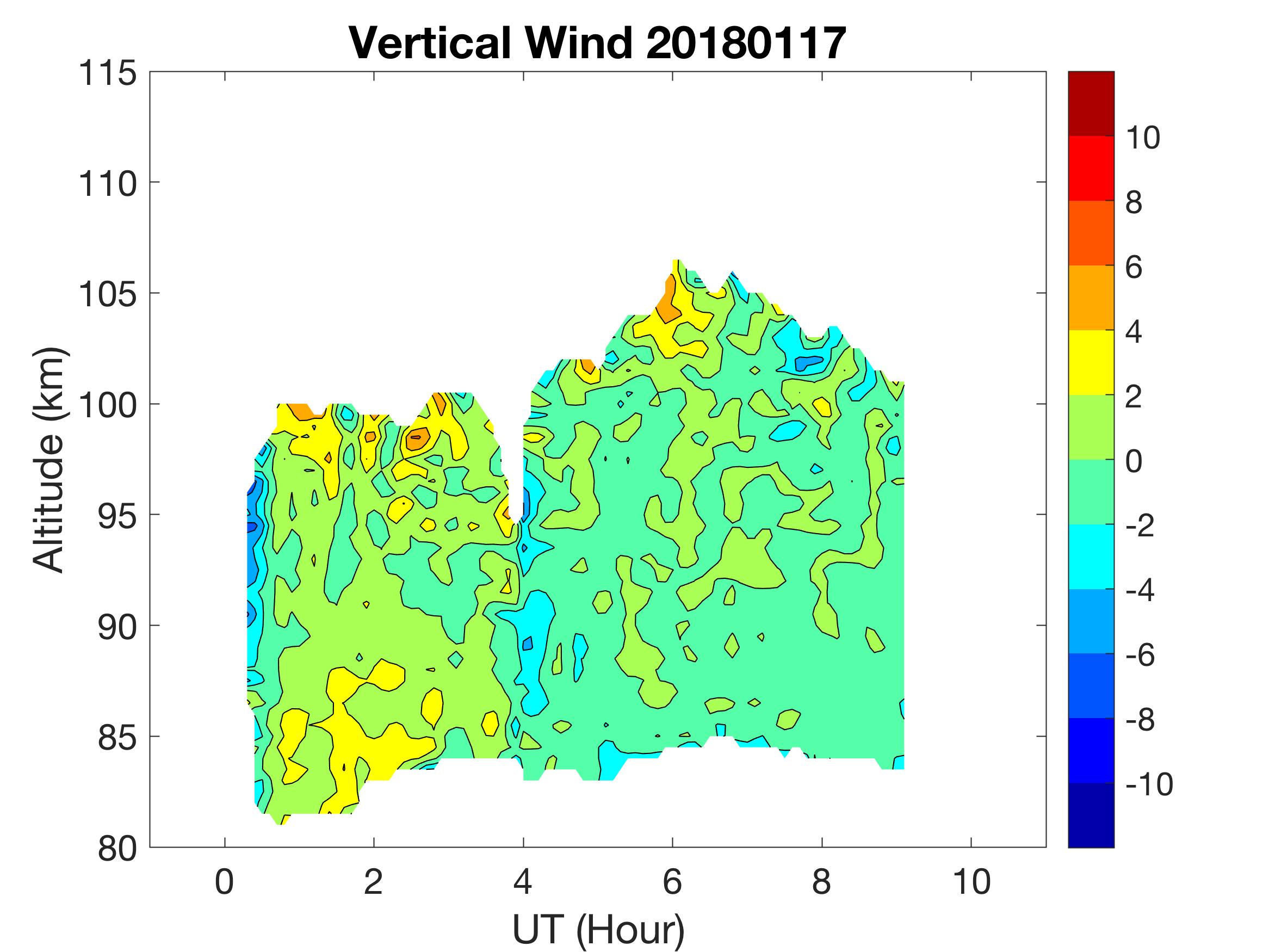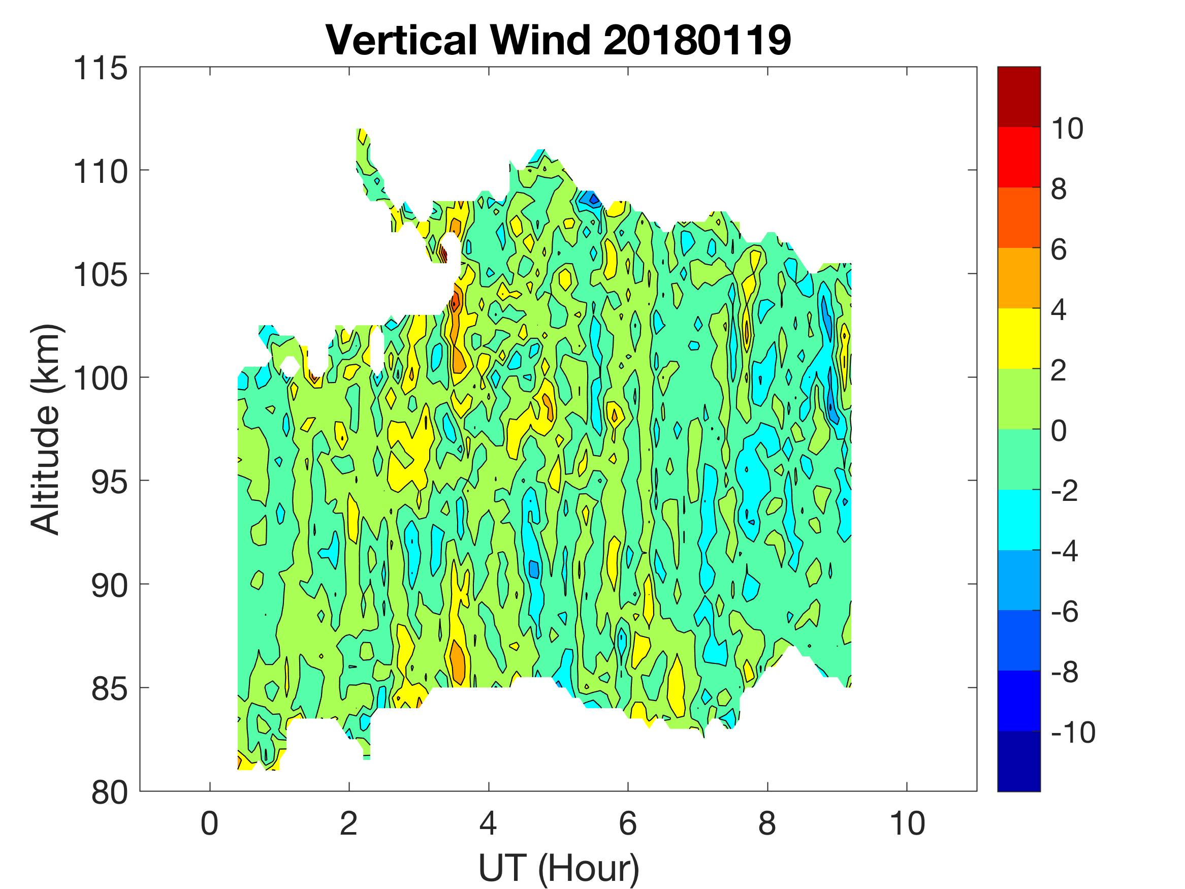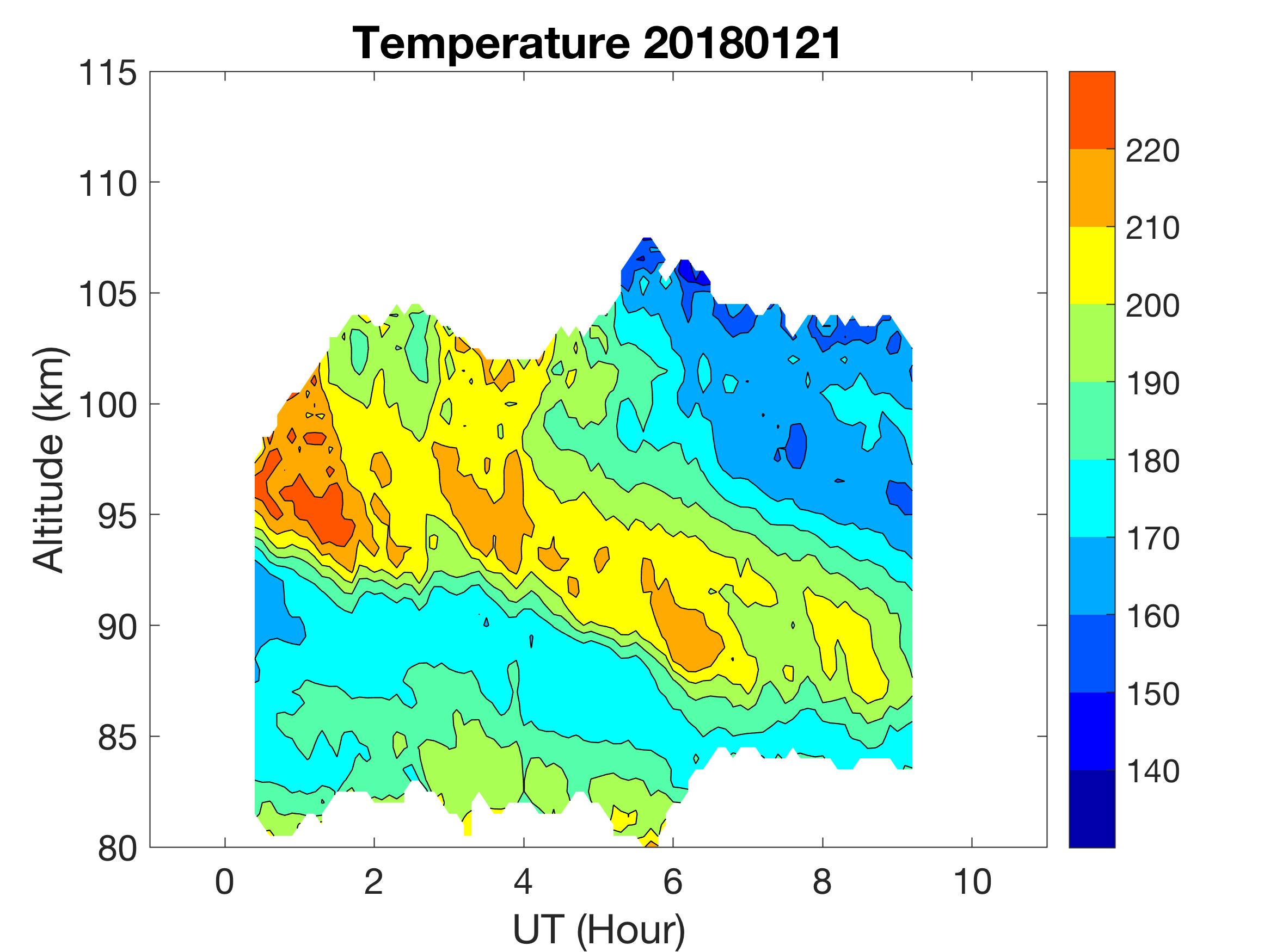 The lidar was operated in zenith mode on all nights. The integration time for processed data is 90 s. The smoothing window is 30 min and 1 km full width due to lower signals up to Jan 18. Starting on Jan 19, the temporal smoothing window is reduced to 15 min due to better signals. No horizontal wind was measured due to beam steering problem. Na mixing ratio contours are added.