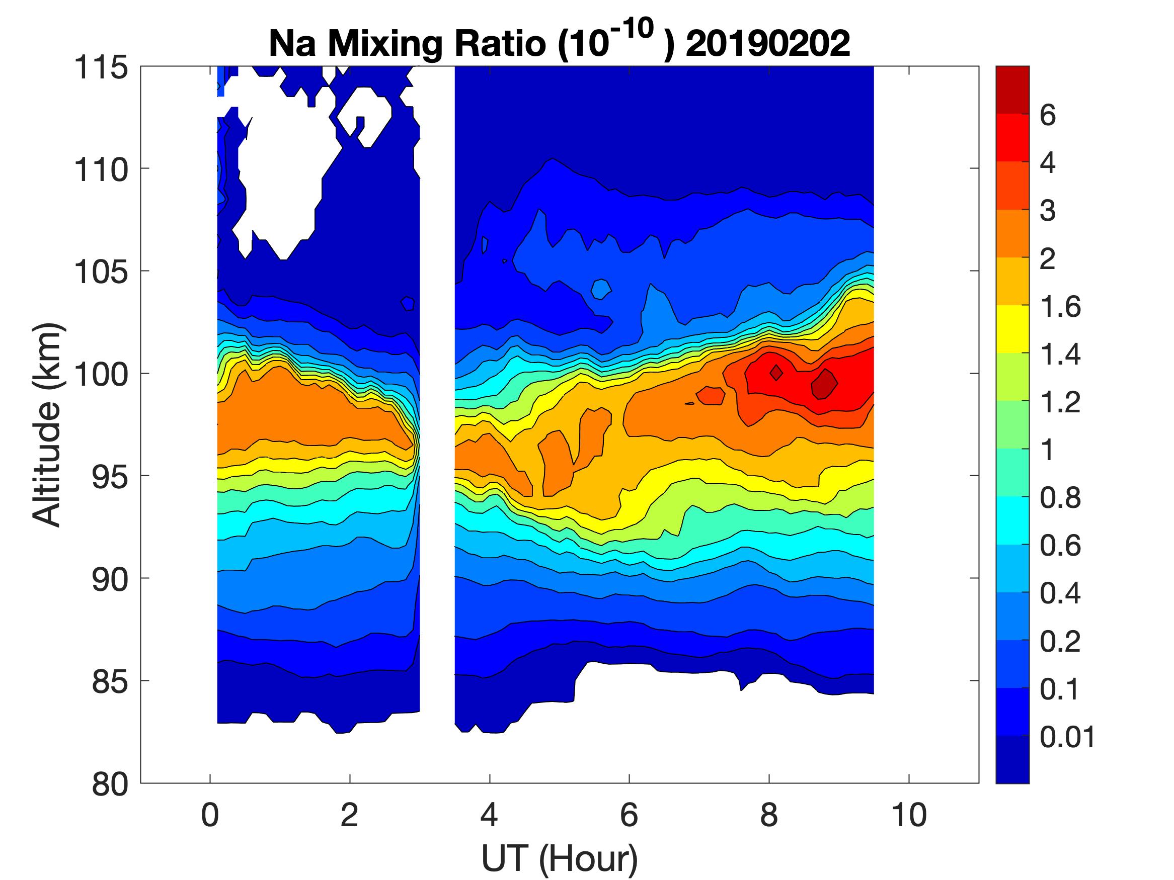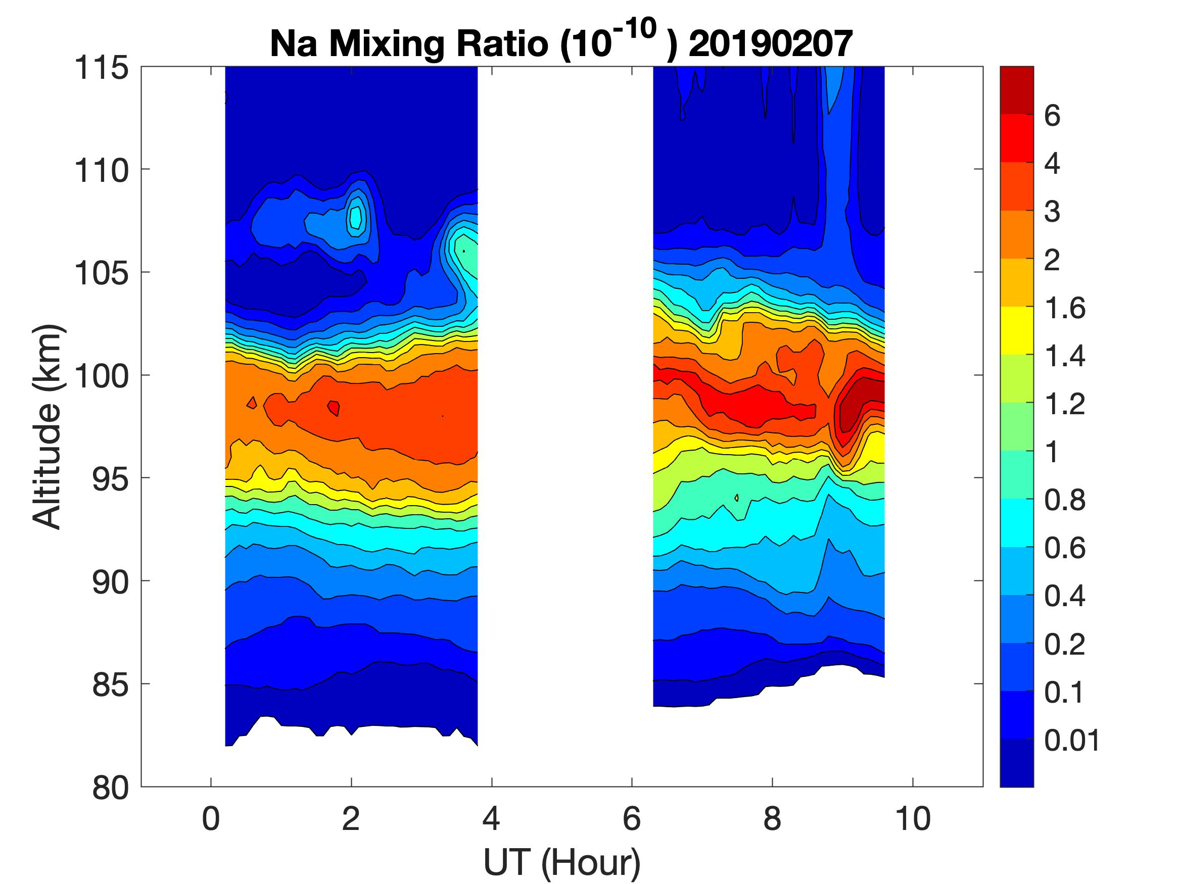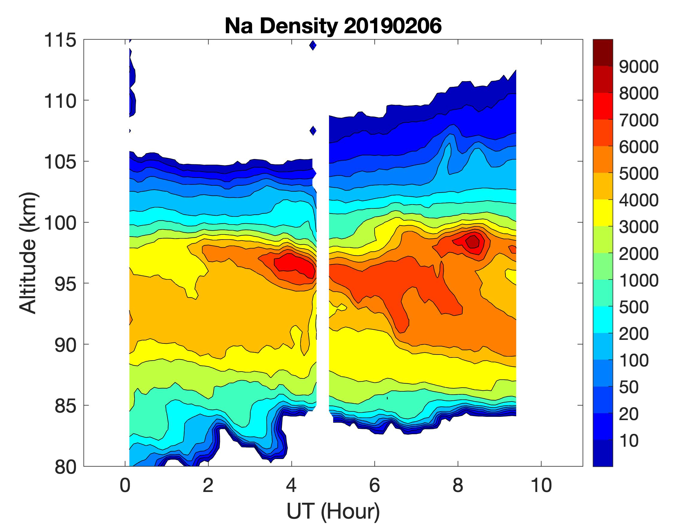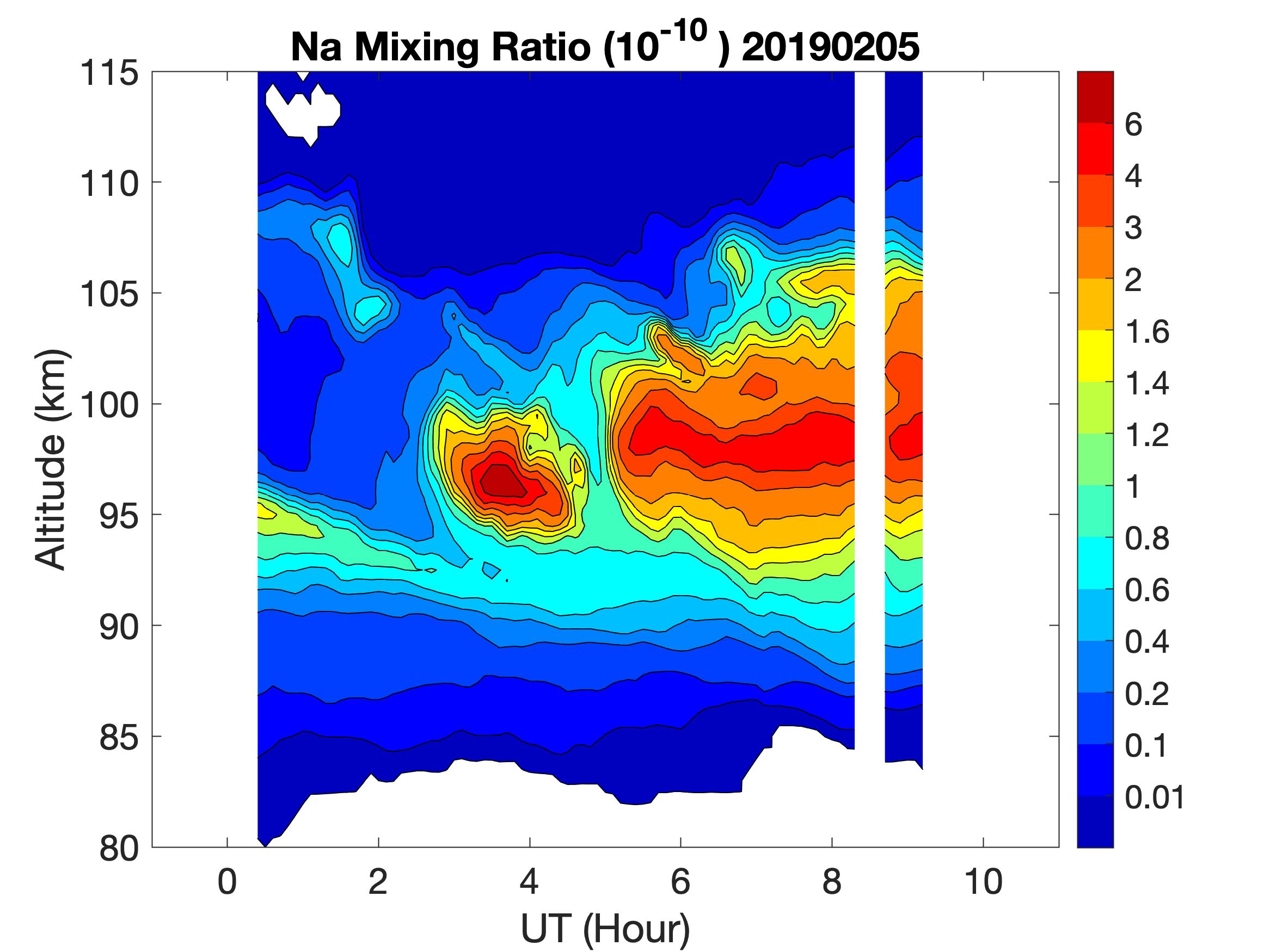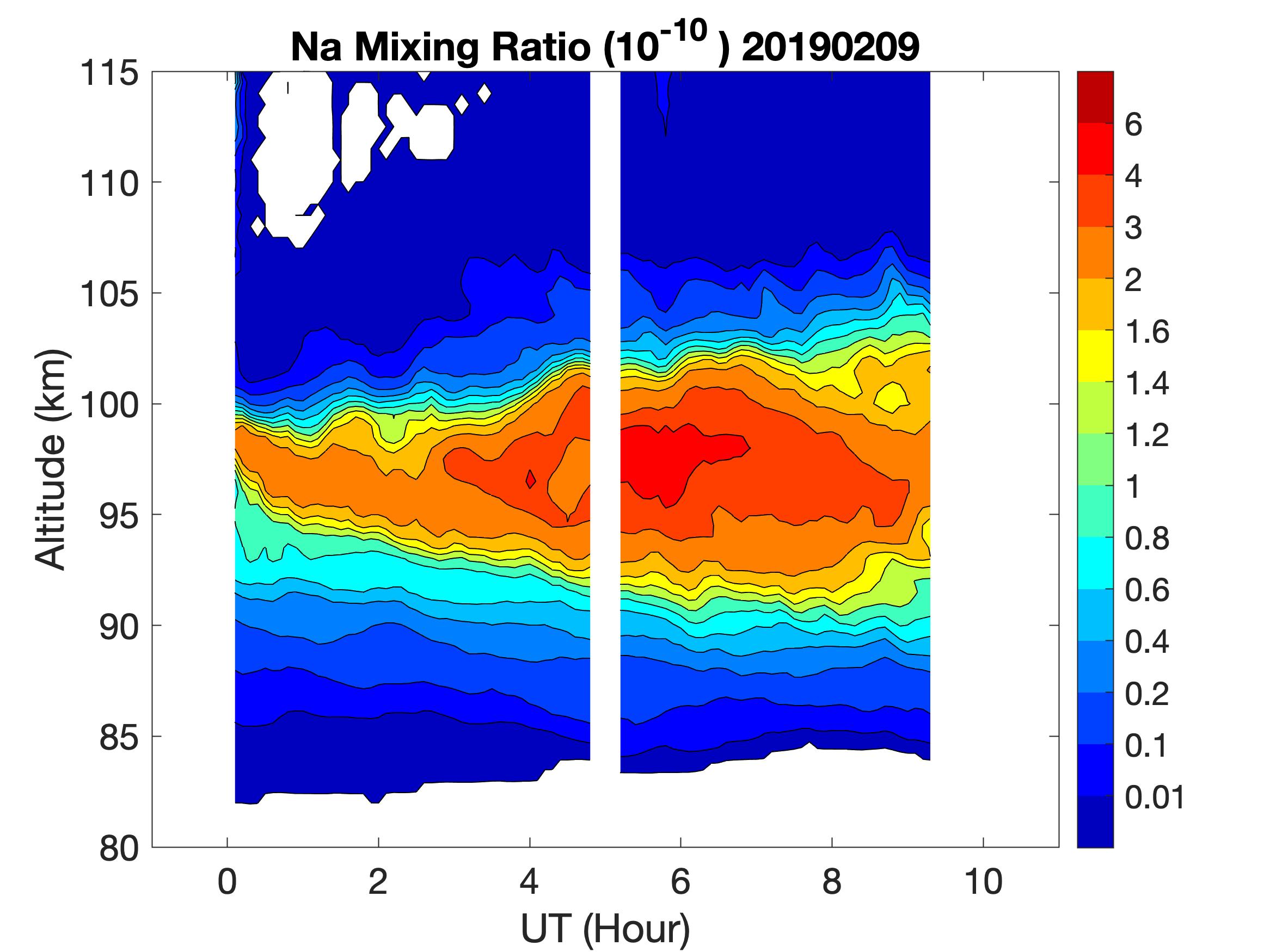 The lidar was operated in zenith mode on all nights. The integration time for processed data is 60 s. The smoothing window is 15 min and 1 km full width. Only Na density and mixing ratio are available because of a failed shutter.