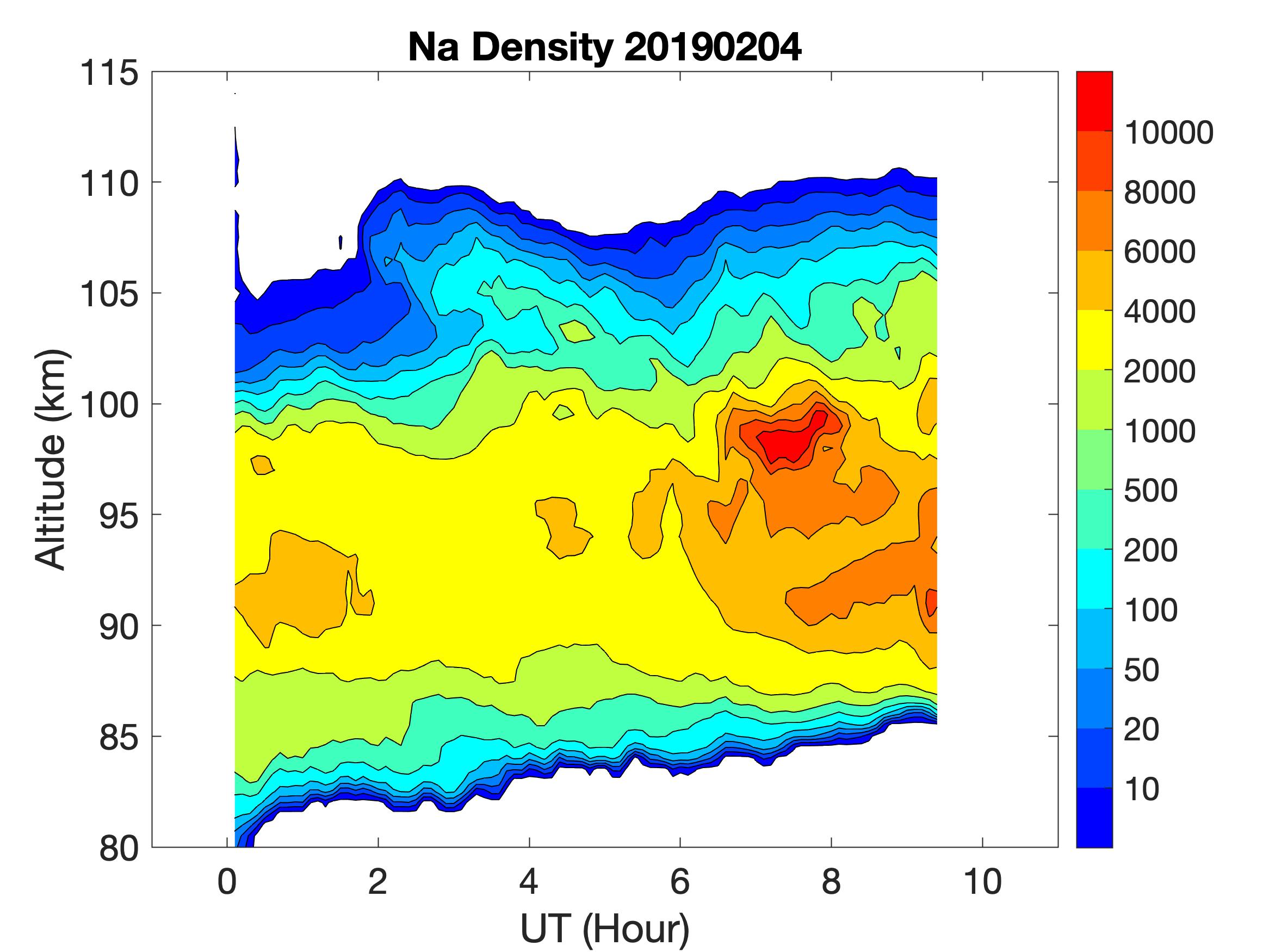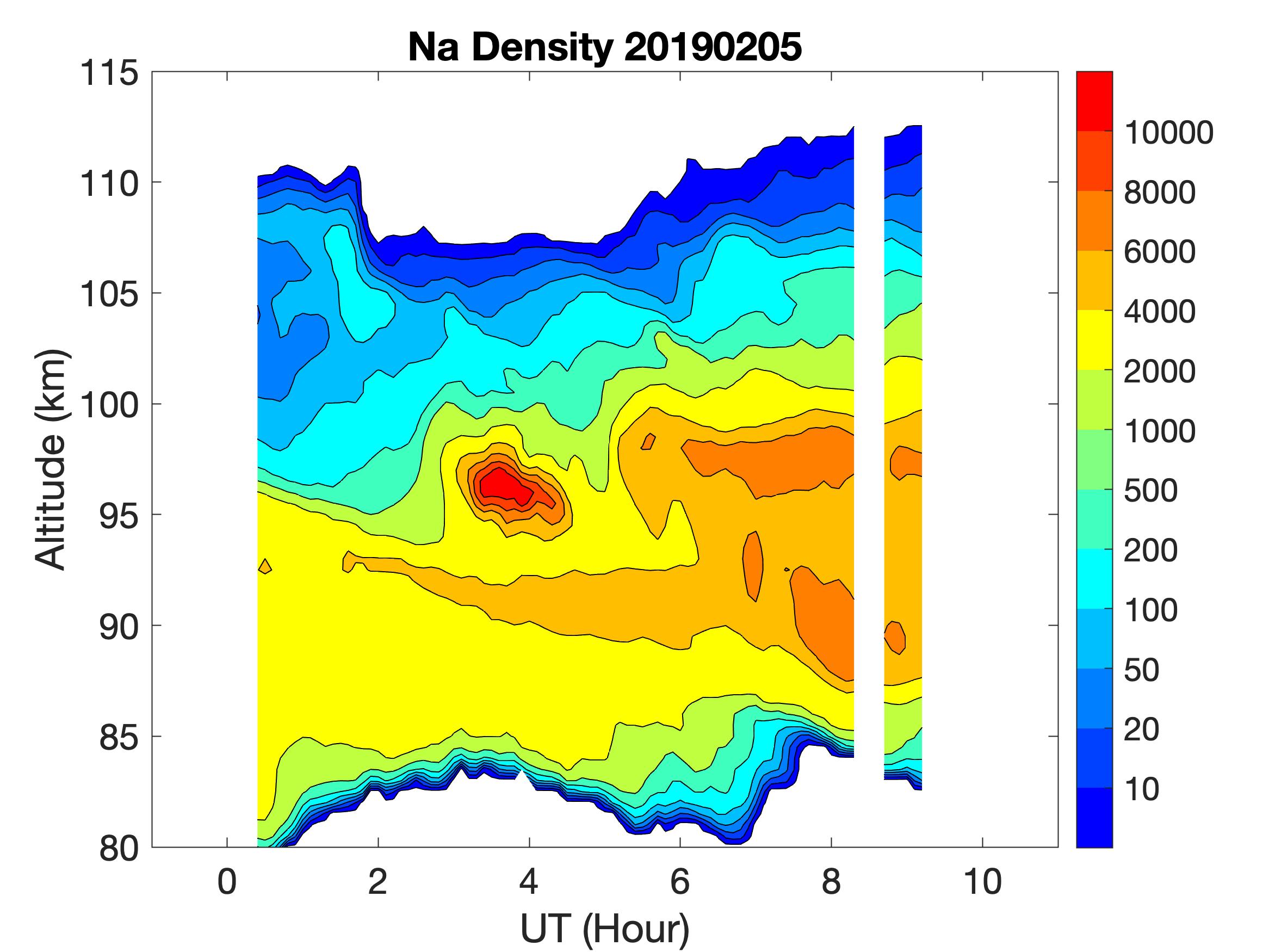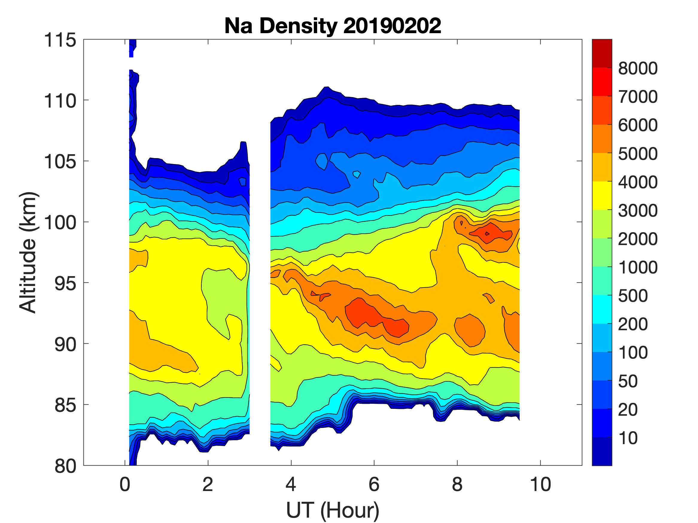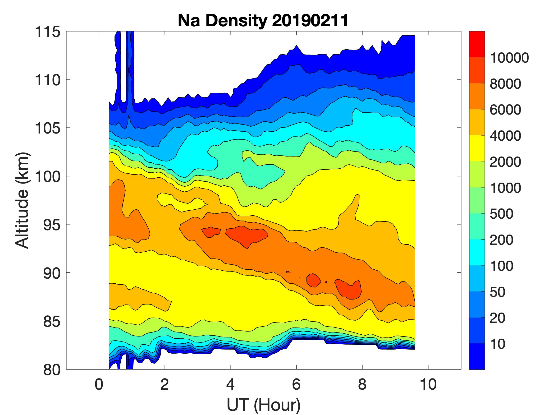 The lidar was operated in zenith mode on all nights. The integration time for processed data is 60 s. The smoothing window is 15 min and 1 km full width. Only Na density and mixing ratio are available because of a failed shutter.